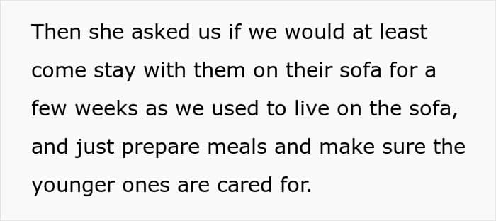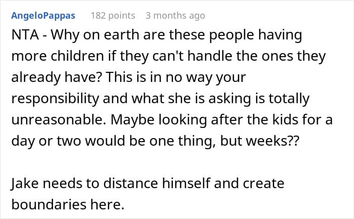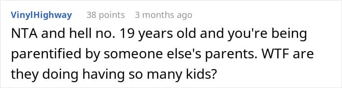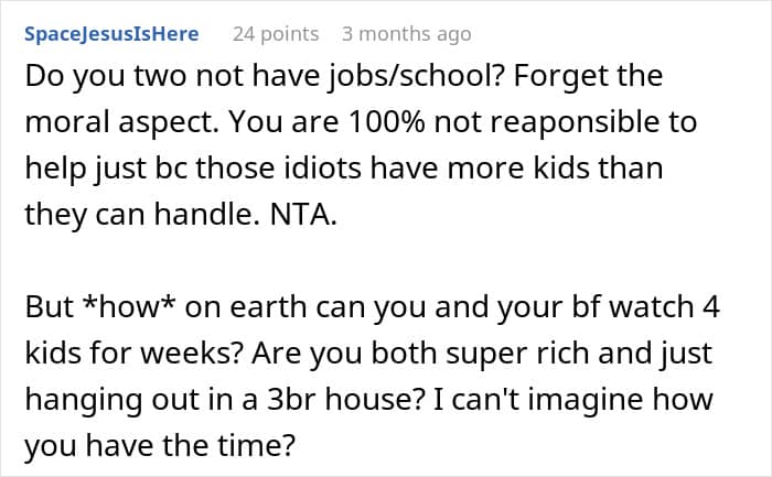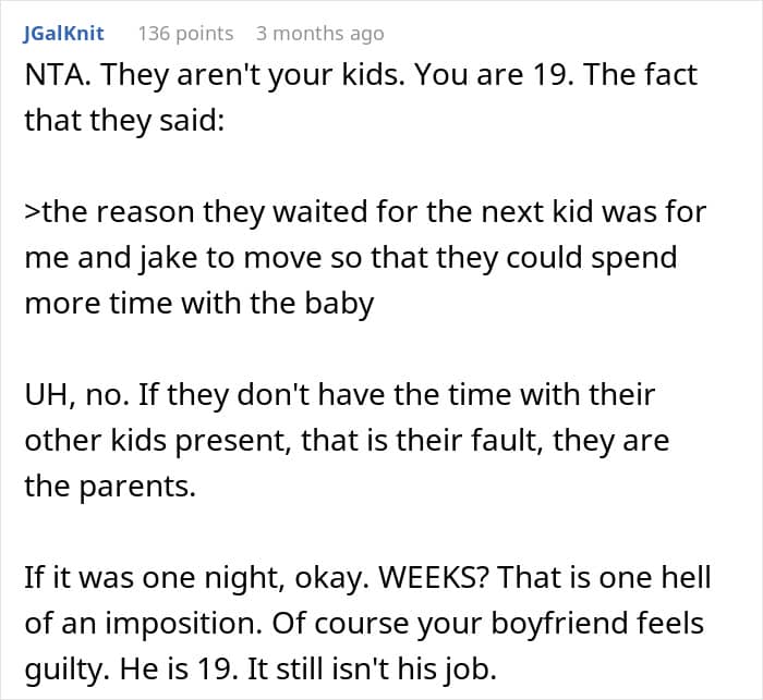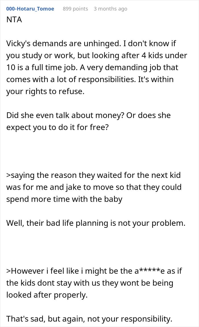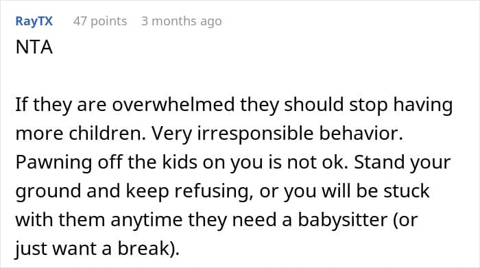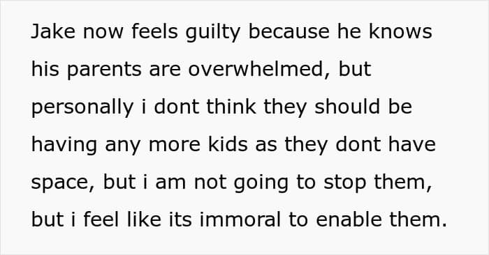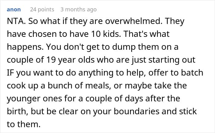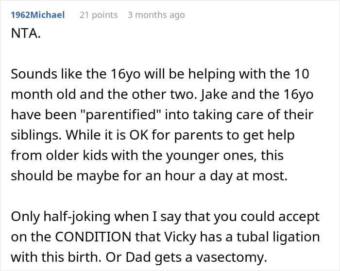 In this story, for example, the mother asked her 19-year-old son and his girlfriend to care for his eight younger siblings while she was in the hospital giving birth to a new baby.