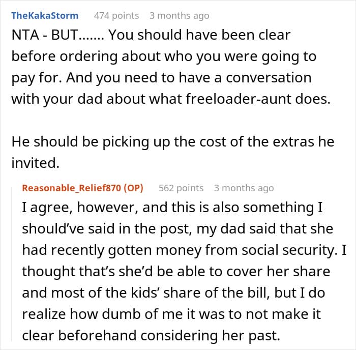 It turns out, the OP’s father had invited his sister and five of her kids to join without letting the host—the OP—know. That put the latter into quite an awkward position in regards to who was going to be covering the bill, but the OP made it clear that it wasn’t going to be them.