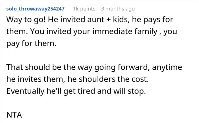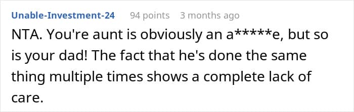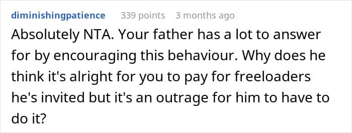 The research also found that it’s the younger ones who were angered by freeloading the most, and that kids become more tolerant of freeloaders with age. Be that as it may, such behavior is not something most would welcome at any stage of their lives. That’s likely why quite a few redditors in the comments criticized not only the father who put the OP in such an uncomfortable situation, but the aunt as well.