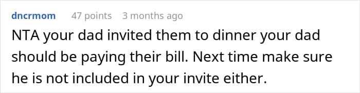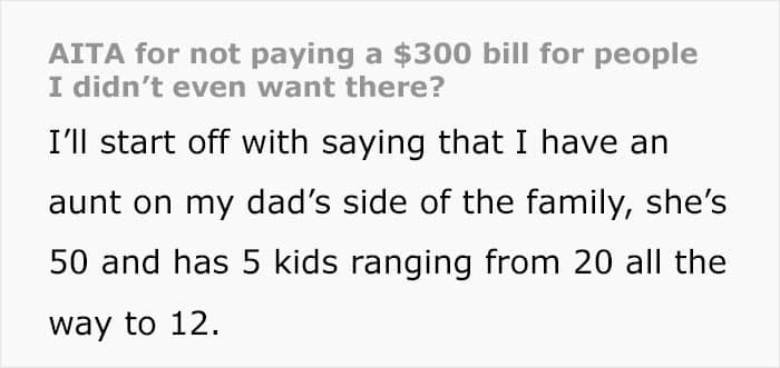 By inviting the aunt and her family to join, the OP’s father put the latter into quite a predicament, as it was no longer clear who was paying. A certified etiquette expert, Lisa Mirza Grotts suggested that when it comes to similar situations, it’s the host that’s expected to pay. However, the OP never invited the aunt or agreed to pay for her and her family. “If there is no host, then it is assumed that everyone will split the bill unless one person offers to host,” Grotts told the Reader’s Digest.