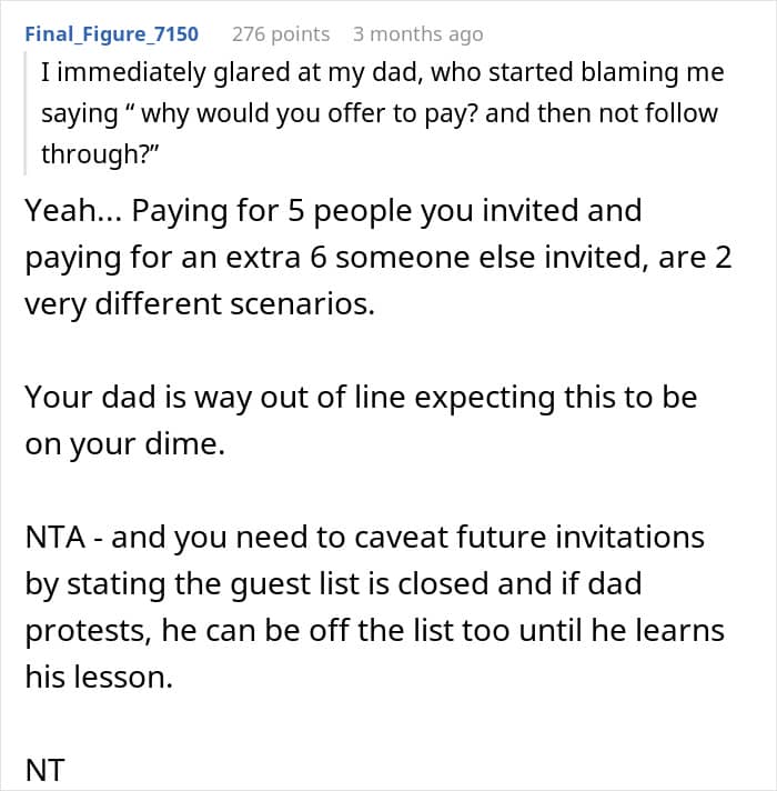 “I felt the most upset by my dad for expecting me to pay for all of my aunt’s kids and then demanding it. It felt a little disrespectful to be put on the spot like that only because I offered to pay for everyone in my immediate family,” the OP told We, expanding on what frustrated them the most about the situation.