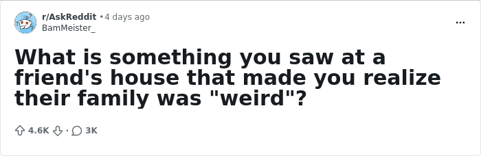 In one Reddit thread, people shared the strange things they stumbled across at friends’ houses that made them realize their families were, well, a little different—and by a little different, we mean seriously weird. From questionable food choices to décor that definitely shouldn’t be in front of kids, scroll down to read their stories. And if you’ve got one of your own, drop it in the comments.