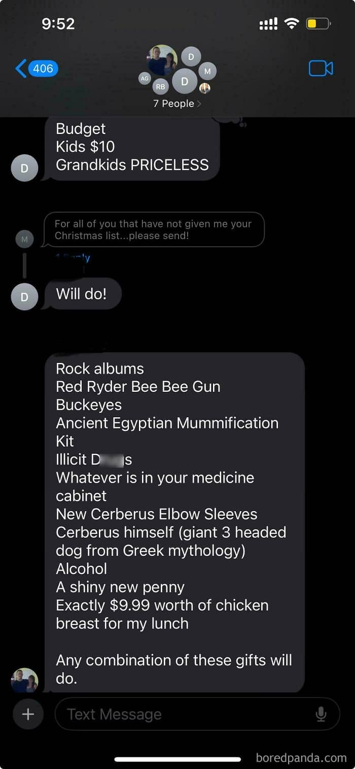 My mom texted the family group chat to send a Christmas list (we’re grown and all married) and this was my brothers response 😂