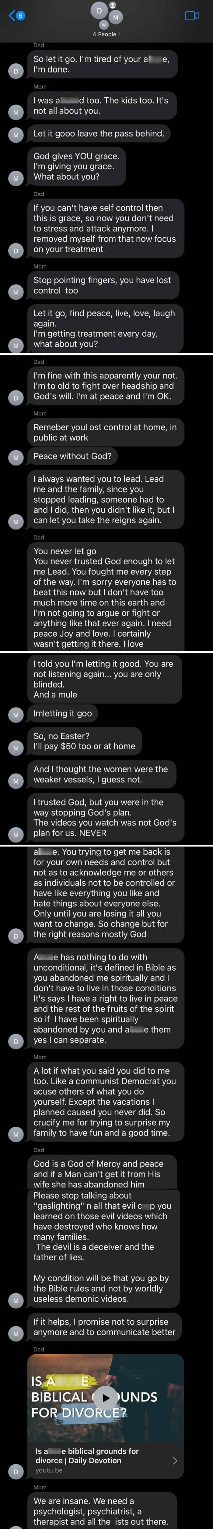 It’s almost hilariously bad how toxic they are. I can’t make this up. So my super religious dad decided divorce is justified in the Bible if there’s “spiritual abandonment”…which has been like…every divorce ever? They’ve been texting nonstop but my mom asked him to point to it in a Bible and stop watching “demonic videos” he…posts a video?