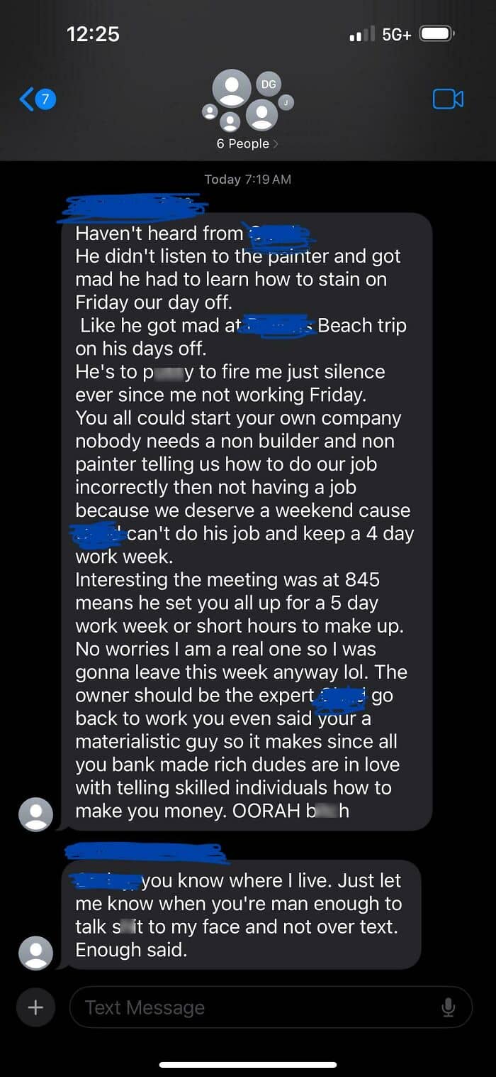 #44 My Boss Hired A New Guy Who’s Super Unreliable And This Is What He Sent Our Group Chat After Leaving A Job Site And Then Missing A Crew Meeting