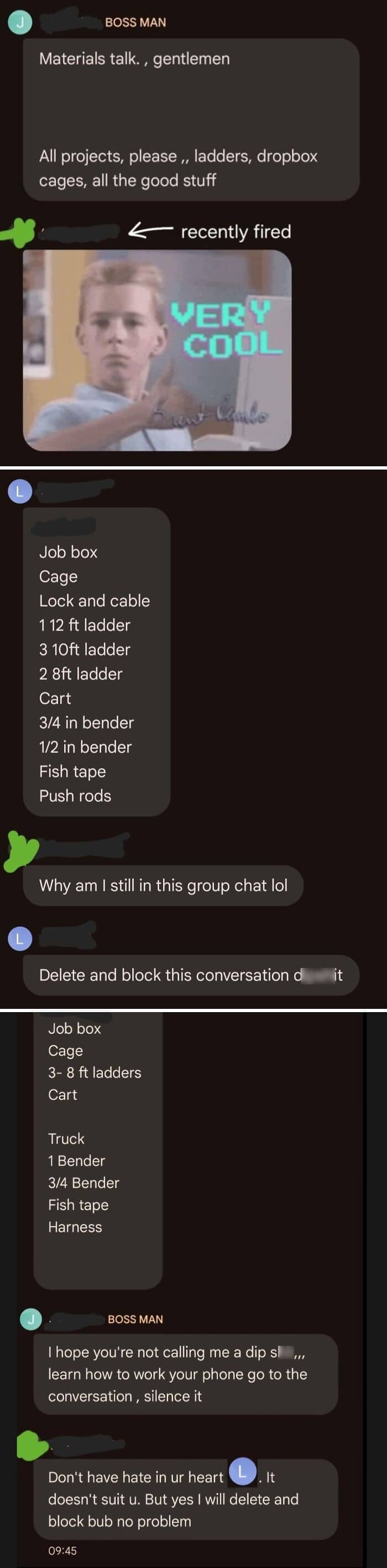 So the context for this is that the green guy was recently fired and the boss is too lazy or indifferent to make a new group chat, and this interaction ends up happening when the boss prompts us for an inventory check. “L” was kind of rude to our ex-coworker and the boss for some reason thought it was for him? Just kind of silly I thought obviously boss man is not paying attention.