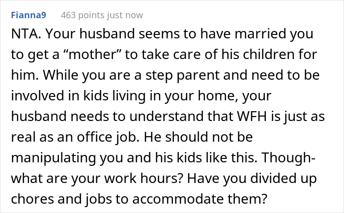 The woman is one of those people who work from home, and her partner believes that means she can do chores around the house. You know, because she physically isn’t in the office. Forget the fact that she also needs to provide for the family.
