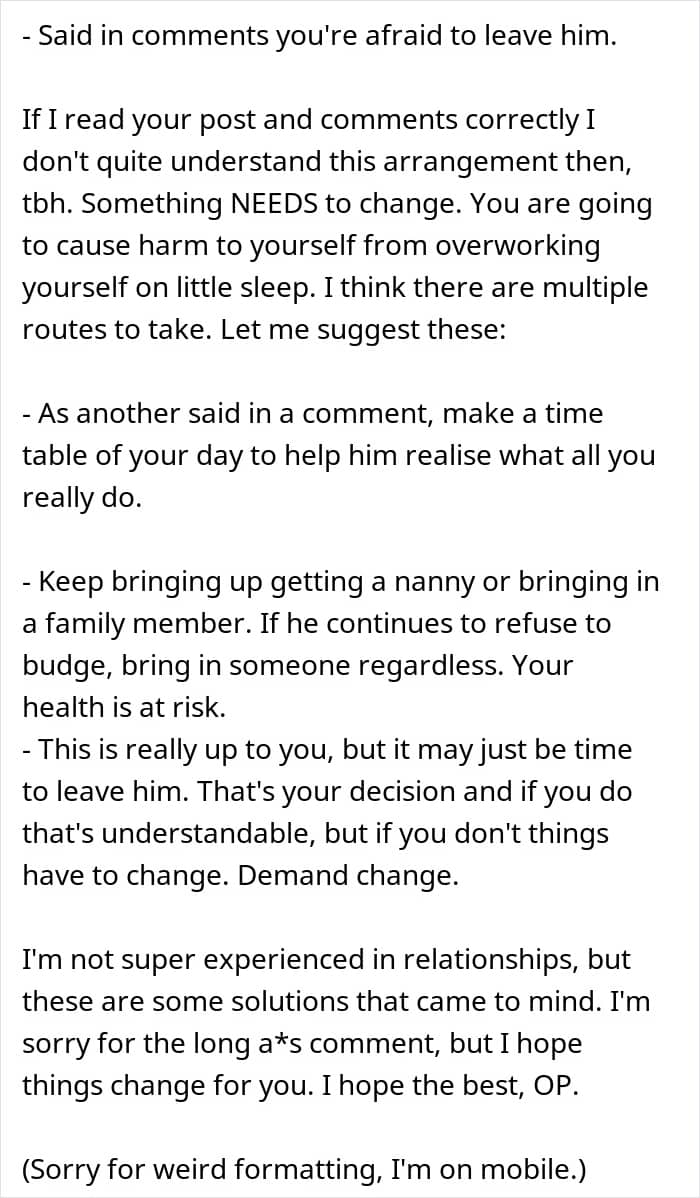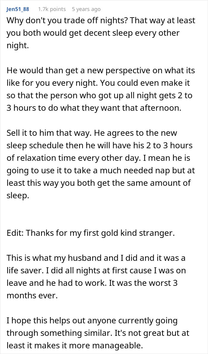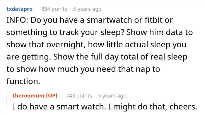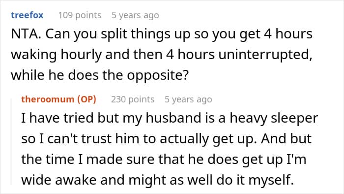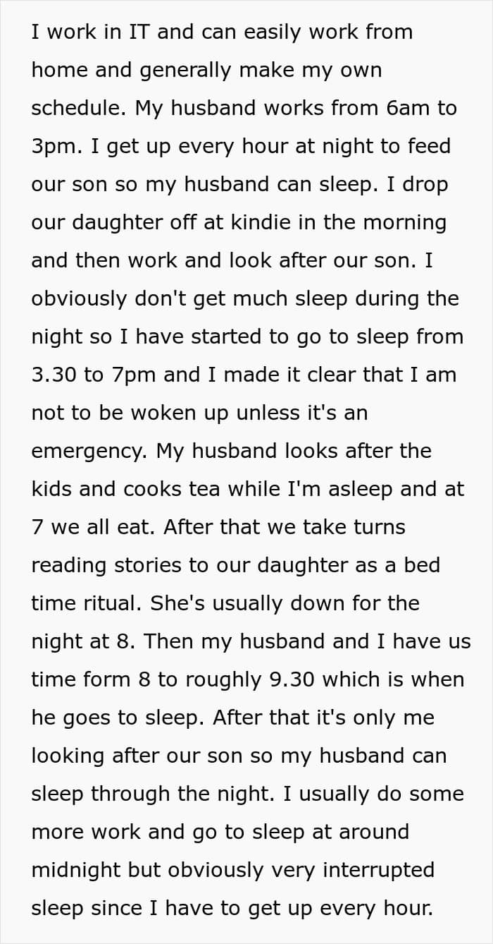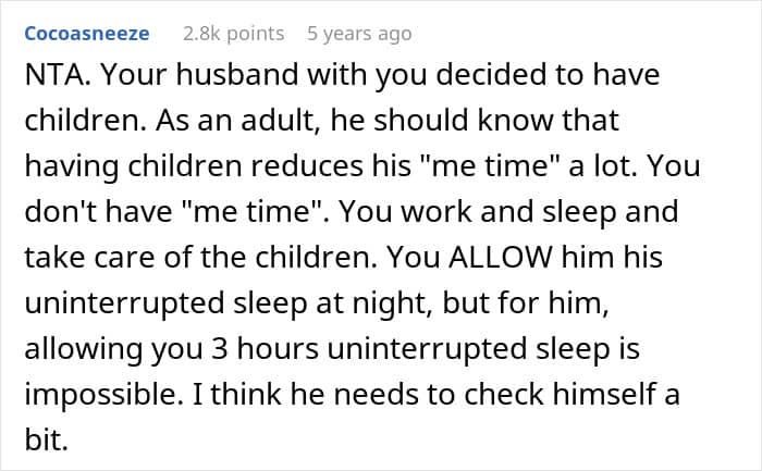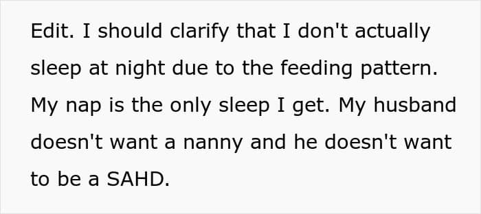 A woman asked the internet if she was wrong to demand to be allowed to take naps during the day, as childcare meant she couldn’t sleep during the night. Her husband thought it was unfair, but was entirely unwilling to pay for a nanny or quit his job to help with childcare. Later, after reading through the comments, she shared what happened next.