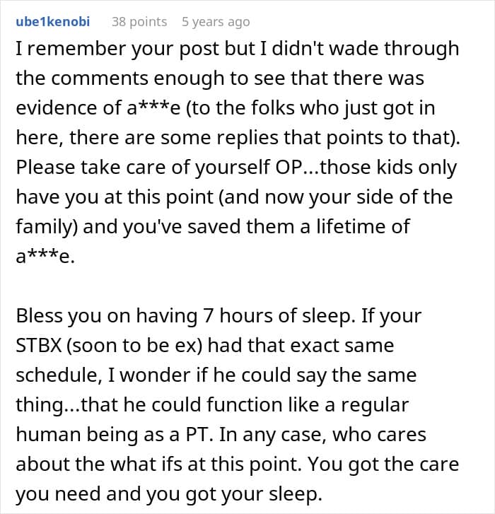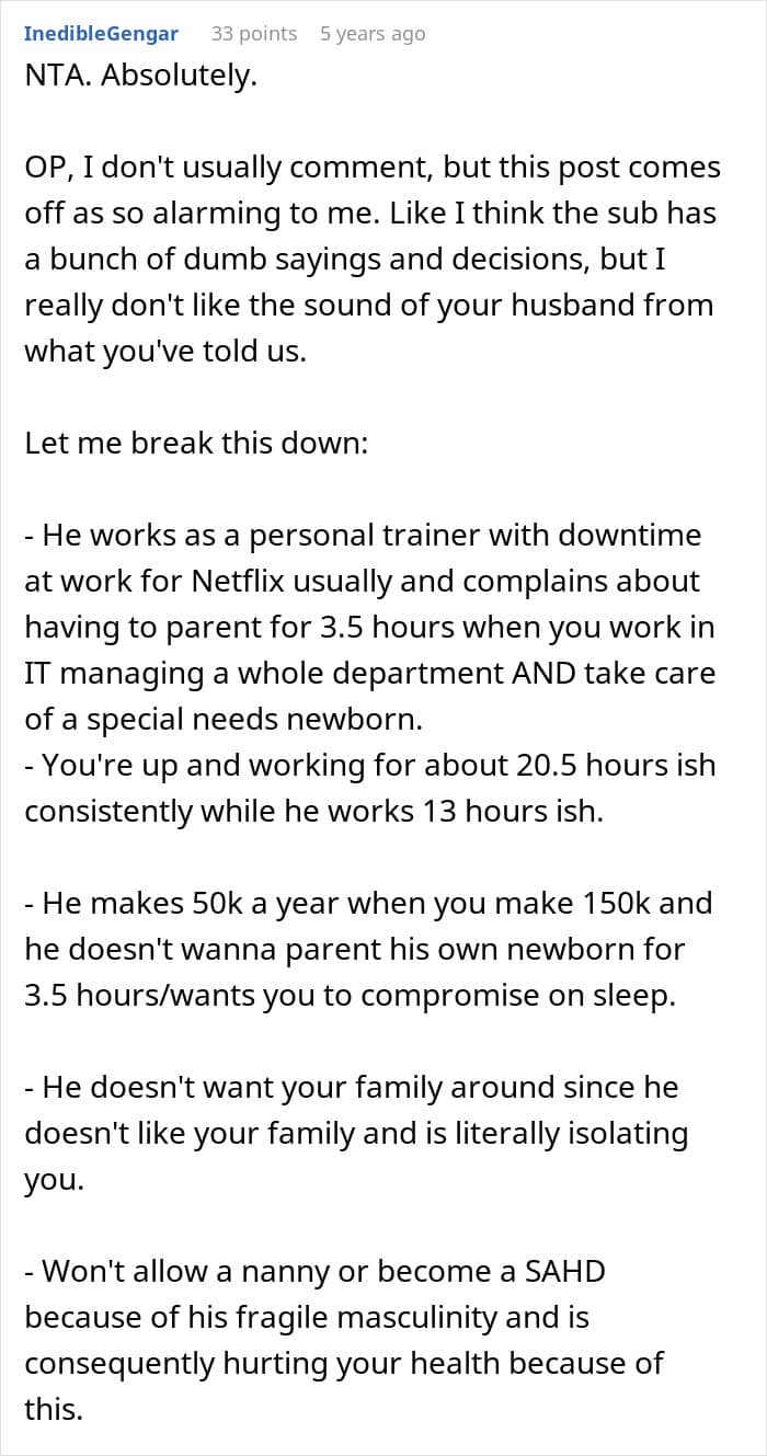 The friction in this household highlights a common issue in modern marriages where the division of labor is measured by hours spent working rather than the intensity of the tasks performed. While the husband fulfills a standard workday, the wife is essentially working a triple shift that includes professional duties, daytime childcare, and the entirety of the nighttime medical routine. This creates an environment where the mental load is heavily skewed toward one partner. The request for relaxation time upon returning from a job is understandable in a vacuum, but in the context of a family crisis, it overlooks the fact that the other partner has not had a moment of true disconnection in weeks or months. When one person is fighting for their basic sanity through a three hour nap, the other partner seeking leisure time can create a deep sense of resentment in the relationship.
