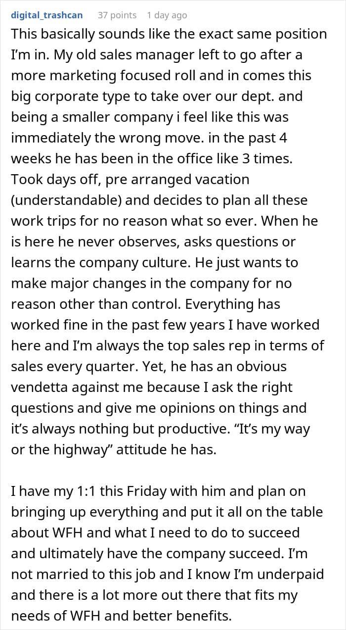 We would love to hear your thoughts on this situation in the comments below, pandas. Do you think this employee made the right decision by resigning, or should he have agreed to go into the office more often? If you’ve ever had a conflict with management at work, feel free to share your personal stories down, and then if you’re interested in reading another We article featuring a manager who came into a company and immediately shook things up, look no further than right here!