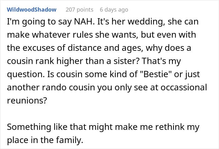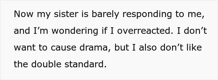 For that reason, the OP told her sister that she and her husband might not attend the wedding because it felt as though they were being treated differently. Her sister got upset and accused her of making the wedding about herself, and their mother insisted the OP let it go because it was her sister’s day. Now, the sister wasn’t responding to the OP anymore, leaving her wondering if she was wrong.