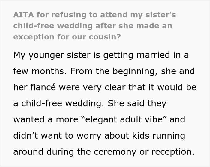 The author’s sister planned a child-free wedding to create an elegant, adult-focused atmosphere and asked her to make childcare arrangements for her kids
