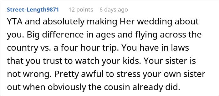 However, through their mother, the OP learned that her cousin who would flying in from across the country would be bringing her two kids after all. Confused, the OP asked her sister about it to which she responded that the cousin wasn’t traveling from across the country and didn’t have trusted childcare for several days.