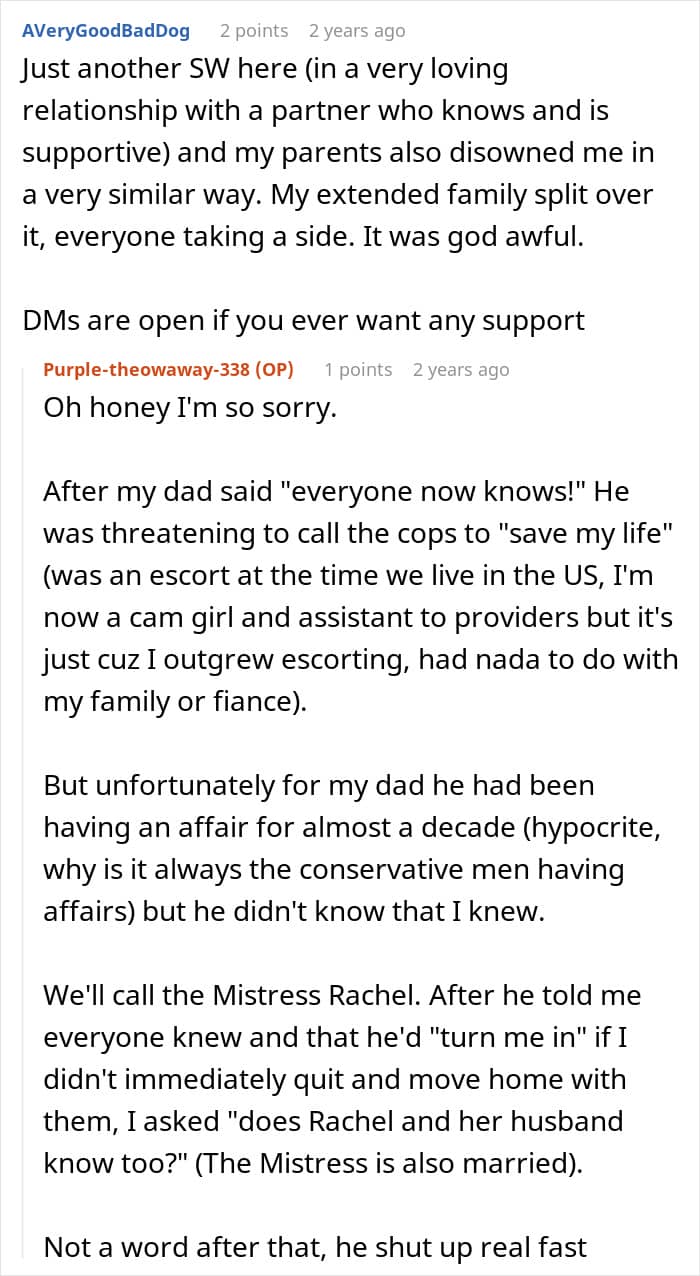 One woman got disowned by her parents after they found out about her escort career. They only ever reached out to shame her, or claim her “fiancé” was either imaginary, or a pimp. When they found out he was real and no pimp, though, things went sideways.