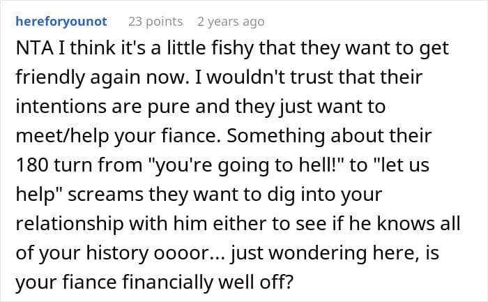Well, OP’s fiancé is no pimp but, sadly, he is very ill. He has severe scoliosis and needs spinal fusion surgery. Her folks found out through Facebook sleuthing and suddenly had a change of heart. Now, with her mom’s nursing background and similar back issues, they wanted to “extend an olive branch” and help care for her fiancé post-surgery.