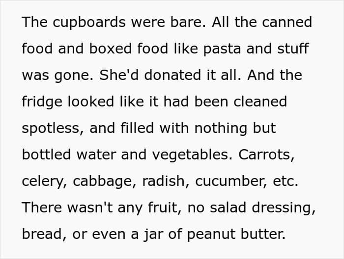 She only left raw veggies in the fridge, and threw away all other food from the house