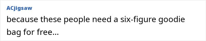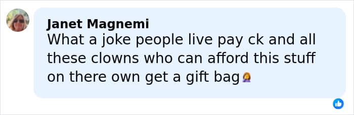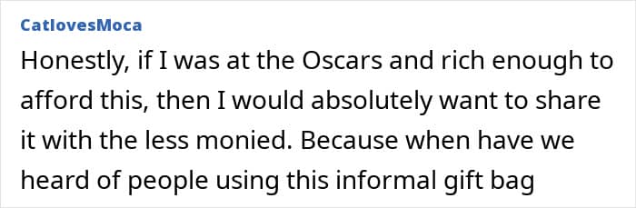 Print-ready PDF • All 23 categories includedInside the Oscars 2026 Gift BagA vegan GUNAS handbagPlant-powered Cavi-art from PETADanucera Sculpt & Lift waitlisted facial from Rescue SpaA Costa Rican villa experience from Essence of DreamsLiposuction experience from ArtLipoBallet (Gold Edition) ultra-secure cryptocurrency storageCustom prenuptial agreement from divorce attorney Jim SextonCentellian24 Lifting Eye CreamFlaus Electric Flosser Starter KitGlymate Lixi Daily SupplementsGROHE Euphoria 140 Shower HeadJapanese luggage sets from Asia LuggageBeboe luxury can**bis productsBENU Movie Star special edition Haute Collection fountain pensSmile makeover package from Beverly Hills Dental ArtsMovie Night Maple Gourmet Gift BoxHydrojug TravelerOOFOS OOahh Plus slidersSupergoop Unseen SunscreenVilla experience in Ibiza from Can NemoT*C-microdosed liquid packets from Cann Social TonicsCBespoke residential interior design packageVital Proteins Collagen PeptidesTruFru StrawberriesTea Forté’s Tea Tasting Assortment Tea ChestArctic villa stay from Hideout VillasDESUAR Spa experienceA seven-day retreat at the Golden DoorWatermelon Glow Pore Tight Toner and Toner Pads from Glow RecipeHaize & Honey Chocolate Chunk CookiesA ten-day holiday in Sri Lanka from SantaniSeñorita T*C-infused non-alcoholic margaritasSuavecito Añejo TequilaFacial rejuvenation procedures from Dr. Konstantin VasyukevichBored Rebel statement teesPlum + Argan Serum from Chanla Chau CosmeticsHUHA better for you underwearINSTYTUTUM skincareChocolate-covered pretzels with gold crystals from Posh PretzelsPortrait experience from LIGHT MVMNT STUDIOThe Jet Set fragrances from On The Nose PerfumesSong Survivor gamePick, Pic, Boom! party card gameDanucera CerabalmBeekeepers Naturals product four-packSkinny dipped almond bites“The richer you get the more free stuff is available to you,” wrote one user