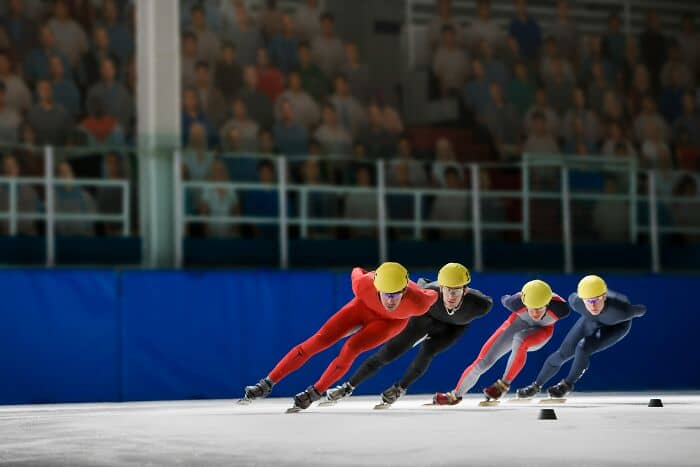 If regular skating is a graceful ballet, short-track is a bar fight on blades. Imagine Mario Kart, but everyone has knives strapped to their feet and there are no brakes. A pack of skaters is crammed onto a tiny hockey rink, zooming around at 30 mph while leaning so far over they are practically licking the ice.