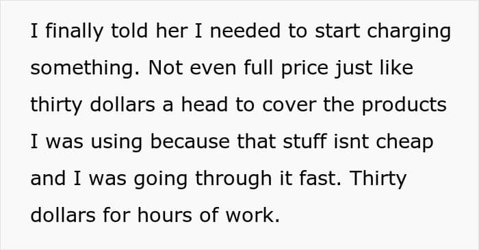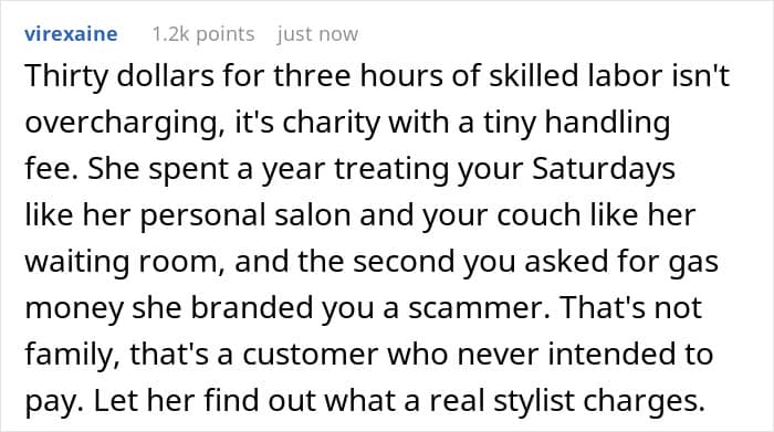 The most shocking part of the betrayal came when she discovered her cousin had been telling people at a family cookout that she was trying tooverchargeher. The audacity of being slandered for a $30 fee for hours of work was the last straw. The narrator promptly fired her one and only freeloader client, telling her to go find out what a real salon charges.