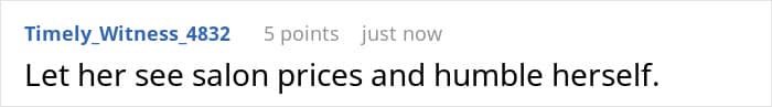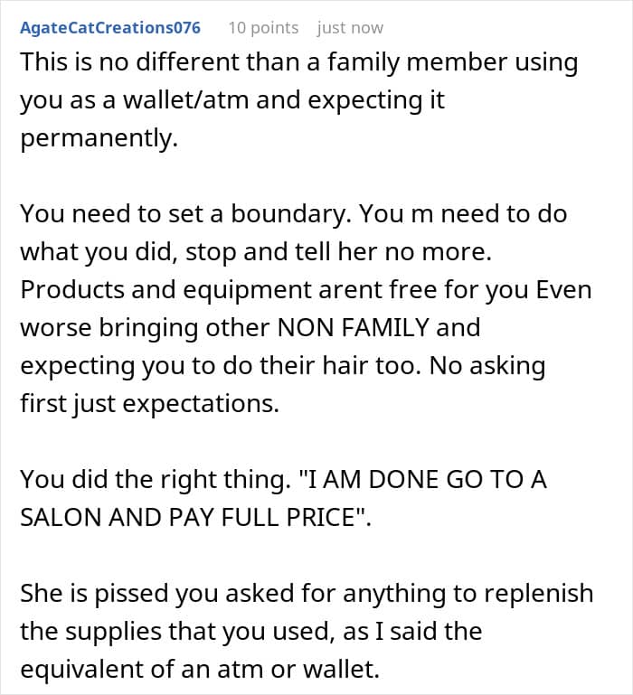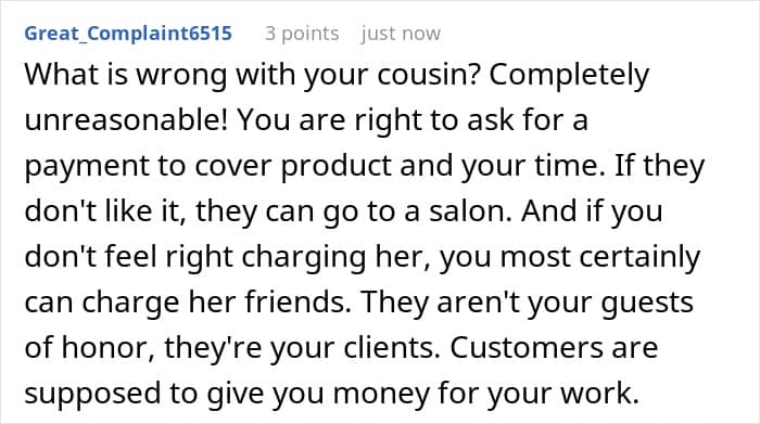 The cousin’s reaction to being charged basically nothing revealed that the true nature of her appreciation was entirely conditional on the service being free. The moment a price tag was attached, however small, the narrator was no longer “family”; she was a “money-obsessed” villain. Blood might be thicker than water, but so is hair products, which cost a lot of money. So, choose your battles wisely!