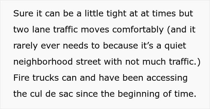 The motive behind this decision? According to Helen, the cars parked on both sides of the street could block the fire trucks from reaching the cul-de-sac in an emergency. The OP says this is all nonsense because the street is wide enough for that. But if we’re dealing with an entitled and stubborn person obsessed with some idée-fixe, when has that ever stopped them?