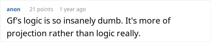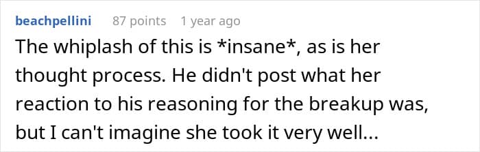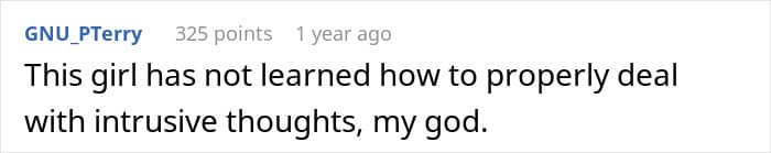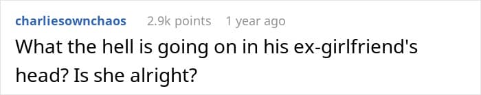 Incidentally, many commenters on the original post think so, too. Most people wrote that the author’s now-ex-girlfriend sounded truly insane, and that the guy must have dodged a bullet with her. “This girl has not learned how to properly deal with intrusive thoughts,” one of the responders wrote quite wisely. So what do you, our dear readers, actually think about this case?