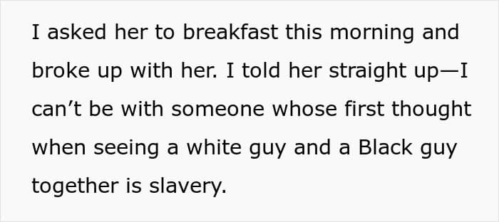 Our hero, whose stepdad is also Black and who grew up in a predominantly Black neighborhood, had never even considered anything like this. This story made the author reconsider the woman he was dating and called their future into question. After much deliberation, our hero decided to break up with her and then asked netizens for their opinions on the situation.