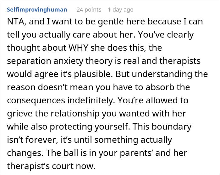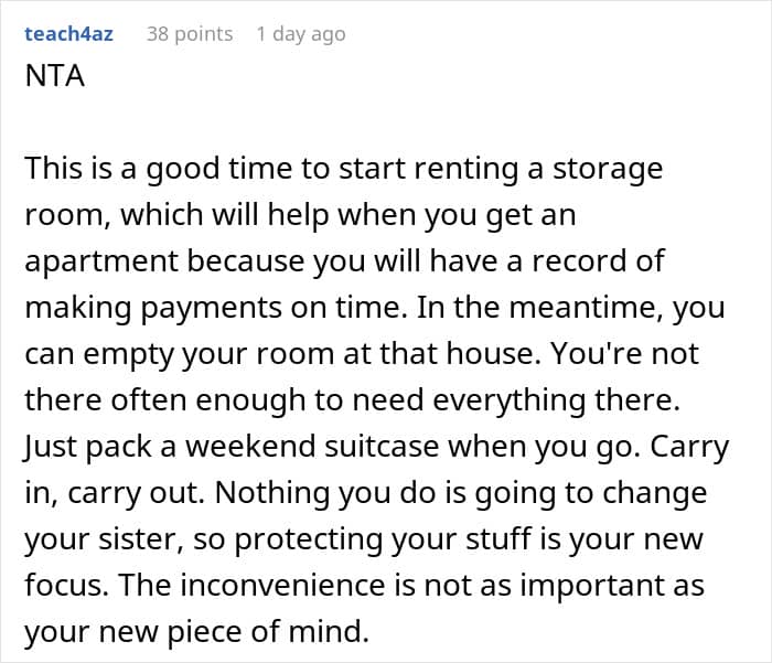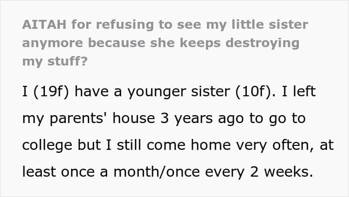 Eventually, OP tried locking her room and taking her valuables back to college. Still, if her sister got even a chance, something else ended up ruined. Exhausted, she made a bold decision: she’ll only visit home when her sister isn’t there. Now she’s taking heat from her folks about it, so she’s asked netizens if her bold boundary makes her a jerk.