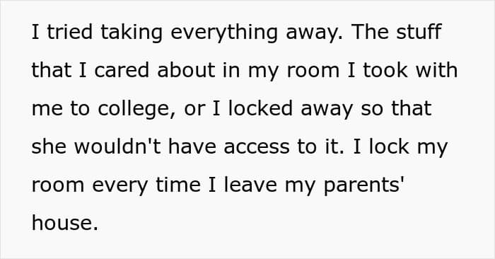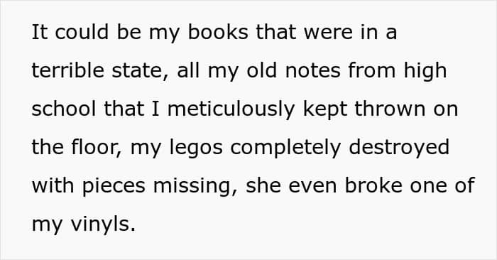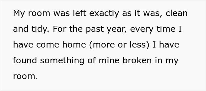 The original poster (OP), a 19-year-old college student, moved out three years ago but still visits her parents regularly. Her bedroom was left exactly as she’d kept it: clean, organized, and full of things she’d collected over the years. Unfortunately, every visit home started revealing the same unpleasant surprise.