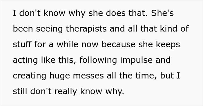 OP knows her sister is still just a kid, but after a year of smashed stuff and the same exhausting pattern, avoiding the situation isn’t about punishment; it’s about protecting the last little bit of her sanity. What do you think? Is OP going too far by shutting out her sister, or is this exactly the kind of boundary that needed to be set? Share your opinion in the comments!
