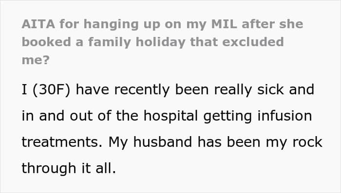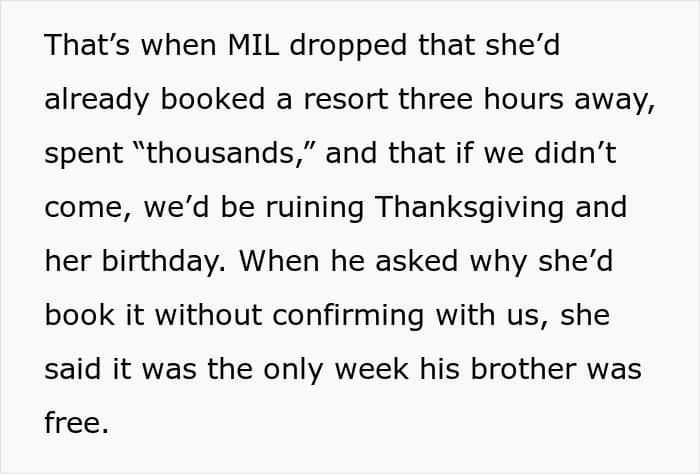 The author’s husband and his mother share a birthday, and recently this lady called her son and invited him to a family celebration at a hotel about three hours outside of the city. Yes, only him – regarding his spouse, the MIL declared that she’d rather “stay home and rest.” And when the man said he couldn’t leave his sick wife, he discovered the hotel was already booked.
