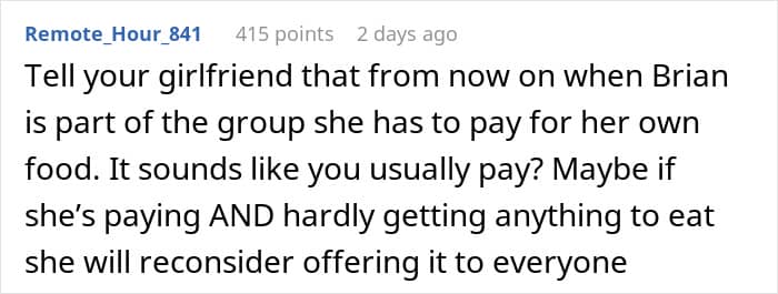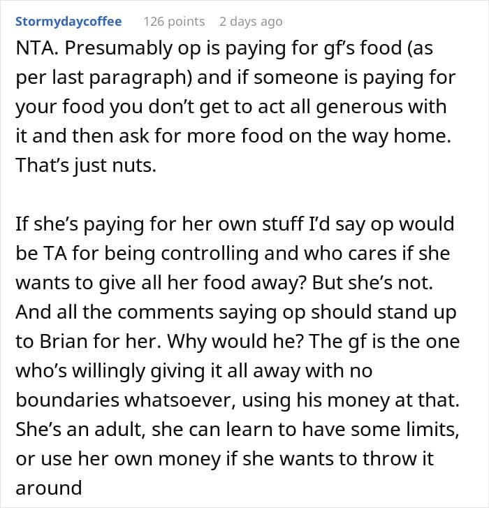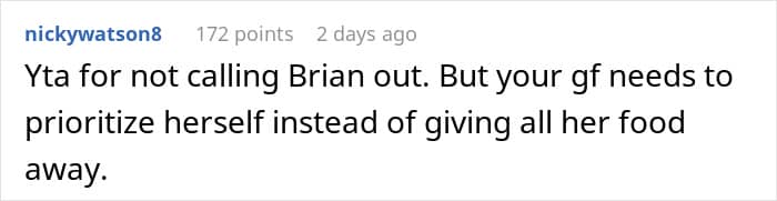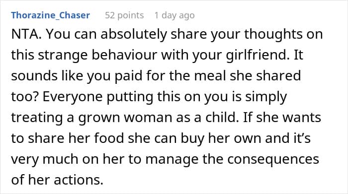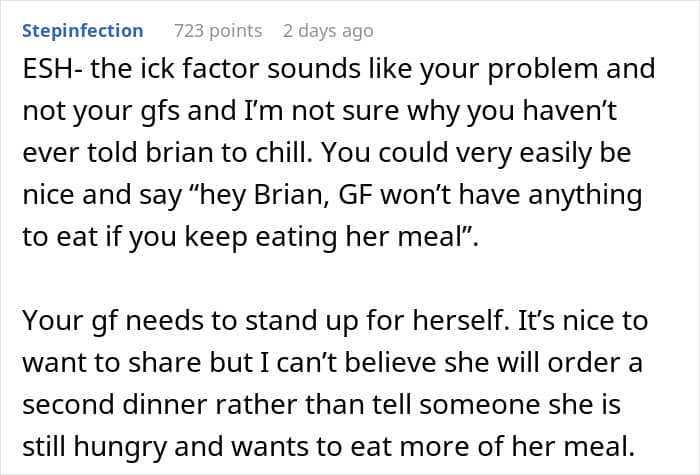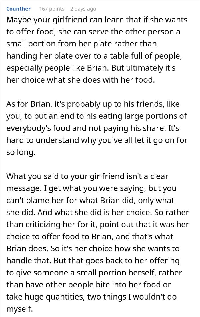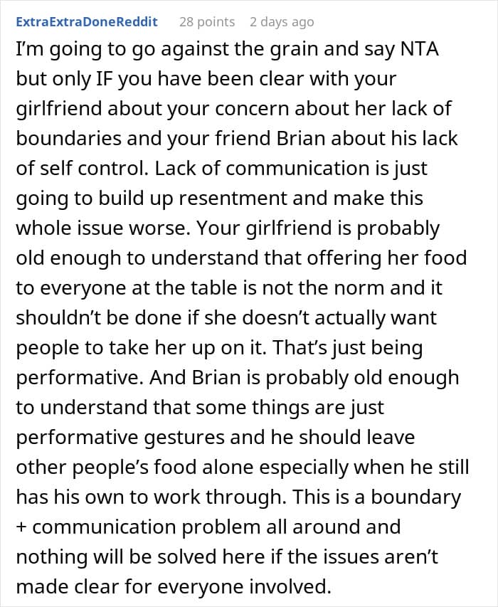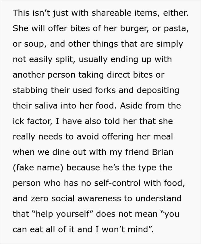 Our relationship with food is not just about consumption. It also involves respect and consideration for others. Reddit user PhantomDetective3548 is concerned that his girlfriend’s kindness is being taken advantage of. When they’re out, she always offers bites from her plate, whether it’s a simple appetizer or her main course, and during their last dinner with friends, one of the guy’s buddies ate far more than he should have, leaving her with mere crumbs. So, he’s turned to the internet for advice on how to get her to set healthy boundaries.