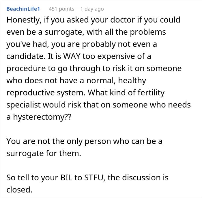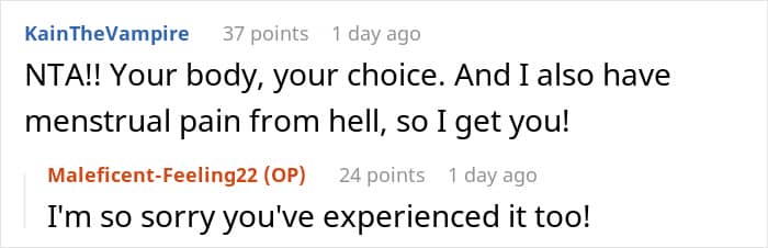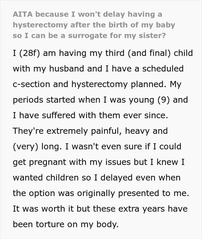 In most cases, the pain begins 24 to 48 hours before your period and subsides within 48 hours of its onset. So, the Redditor’s decision to have a hysterectomy is understandable. Her sister’s insistence for her to become a surrogate, however, is not.