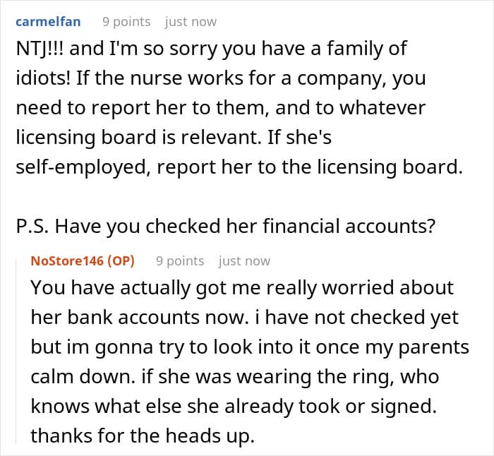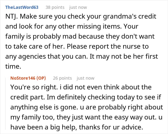 The final incident that made the OP snap happened when she used her spare key to enter the house unannounced. She walked into her grandmother’s bedroom, and was surprised to see the nurse by the vanity putting on makeup and putting on the grandmother’s diamond wedding ring. Immediately, the OP asked her to pack up and leave, but this didn’t sit well with her family members who insisted it was hard to find good care these days.