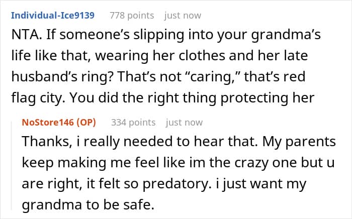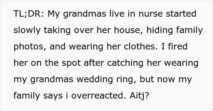 However, what happens when that trust is called into question? Today’s Original Poster (OP) noticed her grandmother’s live-in nurse crossing boundaries, wearing her clothes, moving family photos, and even handling a cherished wedding ring. When she made a decision about the nurse, her family accused her of jealousy.