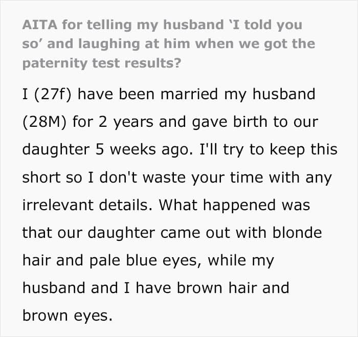 But this woman’s husband couldn’t believe their child could have blue eyes and blond hair, so he asked for a paternity test