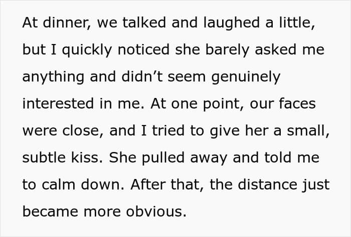 The moment he arrived, the vibe shifted from “soulmate” to “stranger.” The date was a cringeworthy disaster of epic proportions. His attempt to hold her hand was a stiff rejection. His first attempt at a kiss was met with a cold “calm down.” She complained about the food, showed zero interest in him, and the evening culminated in the brutal, trip-defining moment when she physically pushed his face away.