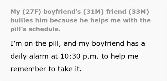 Even though the poster and her partner were on the same page about their birth control, the man’s friend found the entire situation hilarious. He couldn’t believe that the man had been setting a pill alarm daily, and tried to criticize him about it by saying that it wasn’t his responsibility at all.