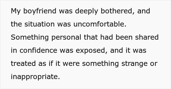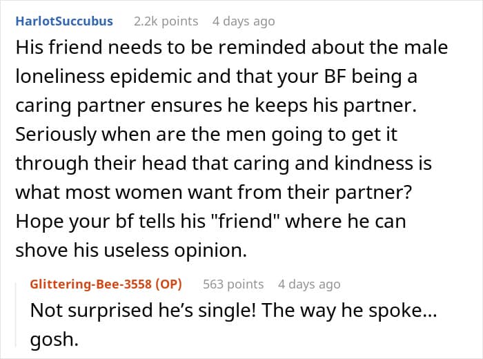The problem is that the OP’s boyfriend took his friend’s words to heart and felt uncomfortable by the jokes that he made, especially since everyone else also heard them. That’s why the poster asked folks online for advice, because she didn’t know if it was unusual for couples to have such an arrangement.