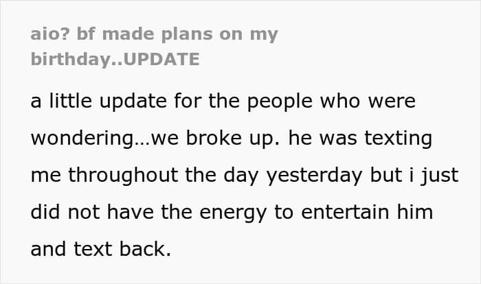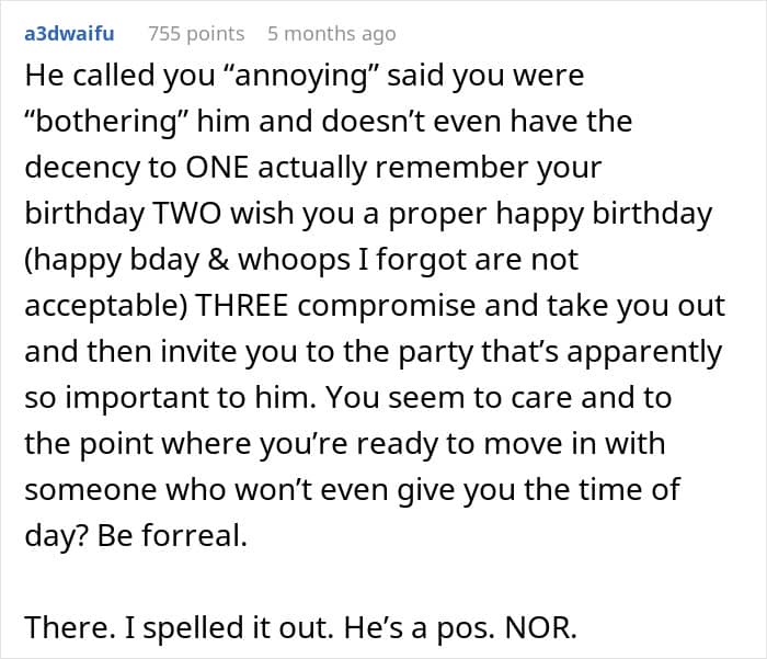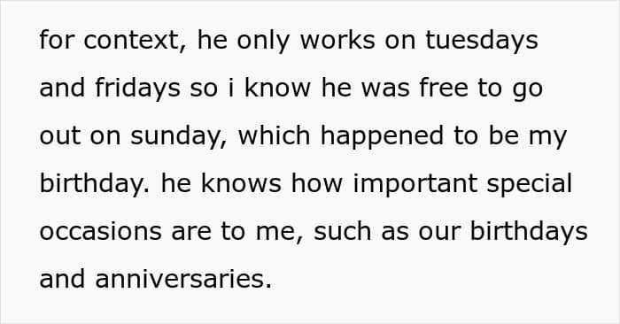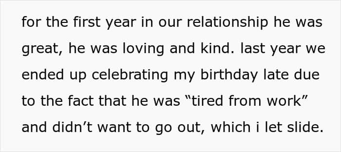 At the start of their almost three-year relationship, the OP shared that her boyfriend was thoughtful, loving, and fully present, especially on special occasions. However, over time, cracks began to show. Last year, he postponed her birthday because he was “tired from work”, even though he only worked two times a week.