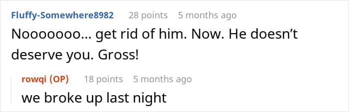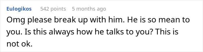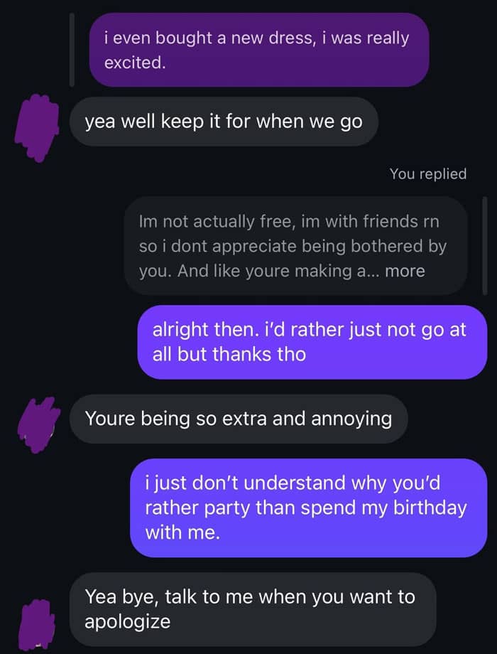 Instead of acknowledging the hurt he caused, her boyfriend doubled down, telling her she was “ungrateful” and insisting she apologize. He suggested celebrating the next day, just like they’d done the year before, but she wasn’t having it.