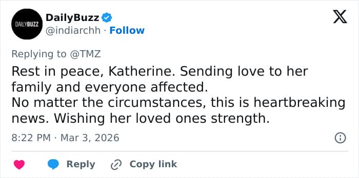 As TMZ spoke to an anonymous close friend of Katherine recently, they remembered her as a “beautiful, empathetic soul” who “took on the baggage of the world.”