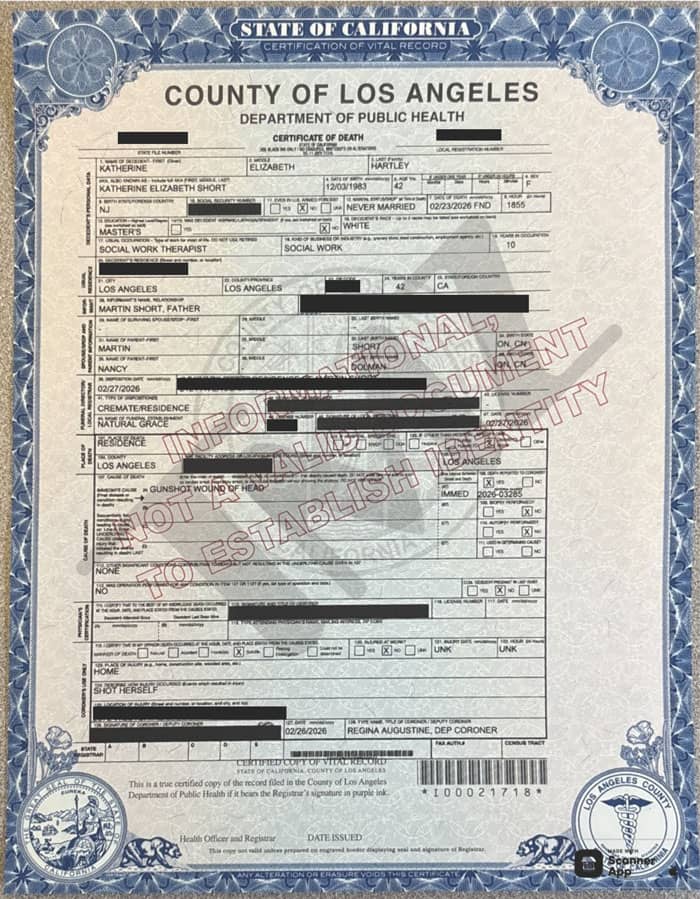 HighlightsThe cause of Katherine Short’s passing has been formally confirmed through her end-of-life certificate, viewed by a notable media outlet.Katherine, a clinical social worker who had openly discussed her mental health struggles, was the eldest daughter of Martin Short.The actor and comedian has postponed public appearances as the family mourns and requests privacy during this difficult time.