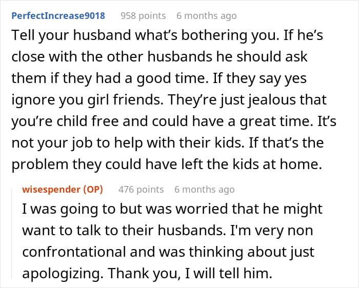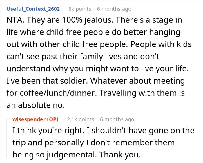 Netizens believe that the OP’s friends were acting out of jealousy rather than genuine hurt. They highlighted that her child-free lifestyle allowed her more freedom on vacation, which seemed to bother them, who were tied down with childcare. Others emphasized that traveling with friends who have kids often leads to different expectations, making trips like this a challenge.