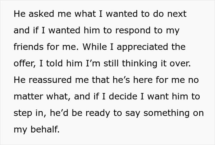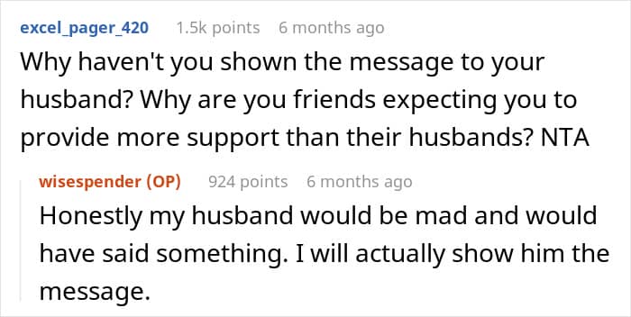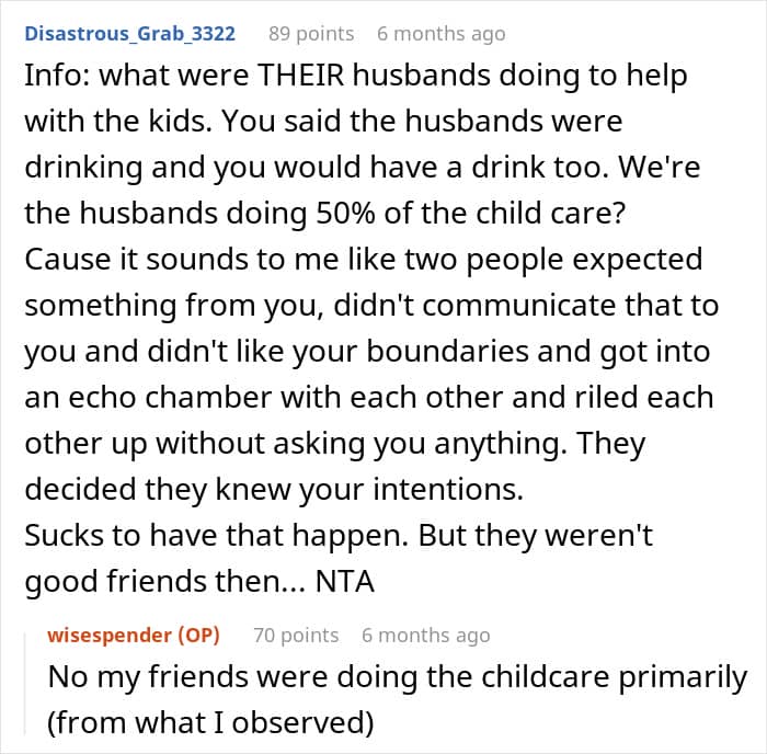 She also accused the OP of being selfish for not focusing on their needs, particularly as moms, and that she was “just partying” instead of acting her age. Naturally, the message left her in tears, completely unsure of how to respond. She had been under the impression that everyone was having a good time, only to be blindsided by resentment she hadn’t seen coming.