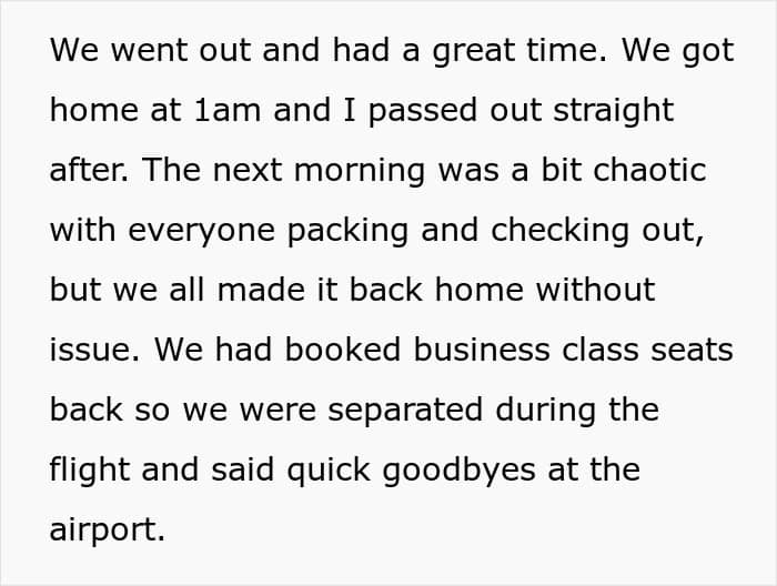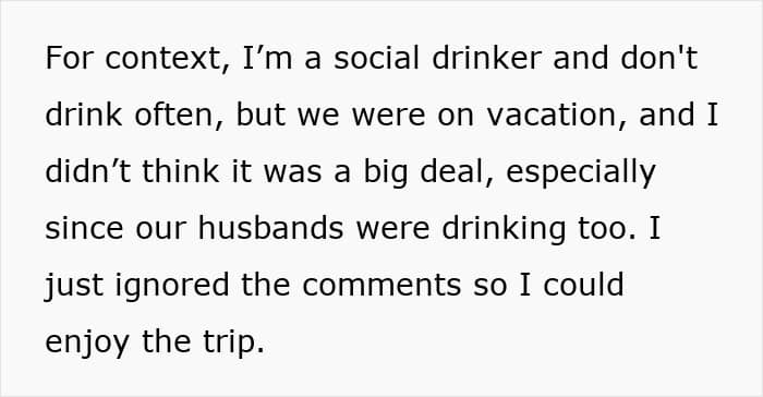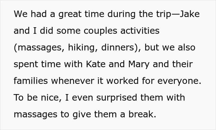 A week after returning home, the bomb dropped. One of the friends sent a lengthy message explaining that she and the other friend wanted to distance themselves because the OP had ruined their trip. The grievances ranged from her drinking habits to not spending enough time with them or helping out with their kids. There was even criticism about booking different flights.