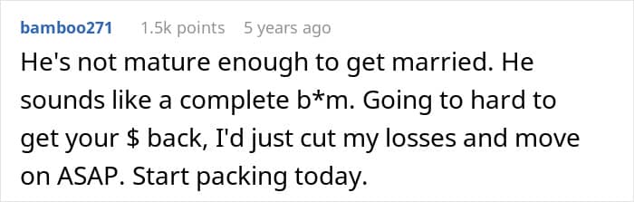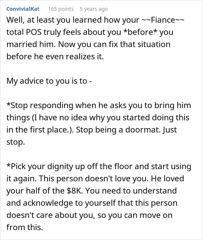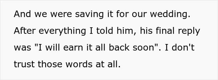 That’s exactly what happened to this woman. Her fiancé took money they’d been saving for their wedding and spent her contribution on himself without permission. Now he barely acknowledges she exists.
