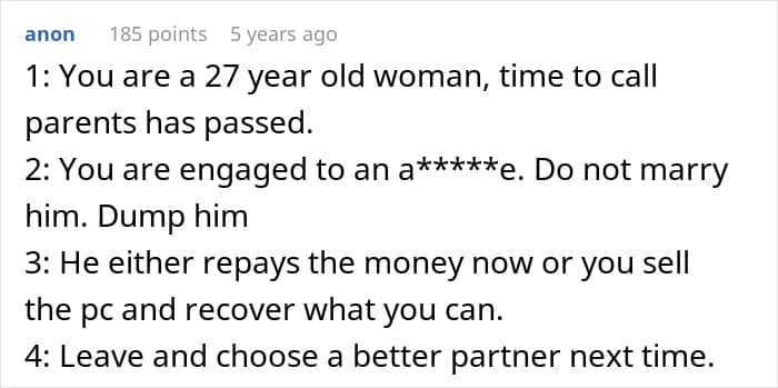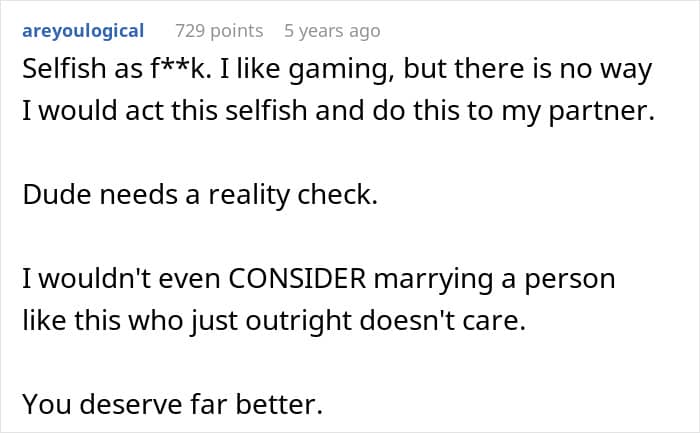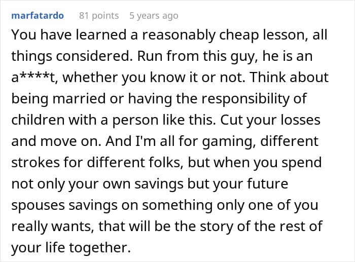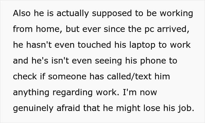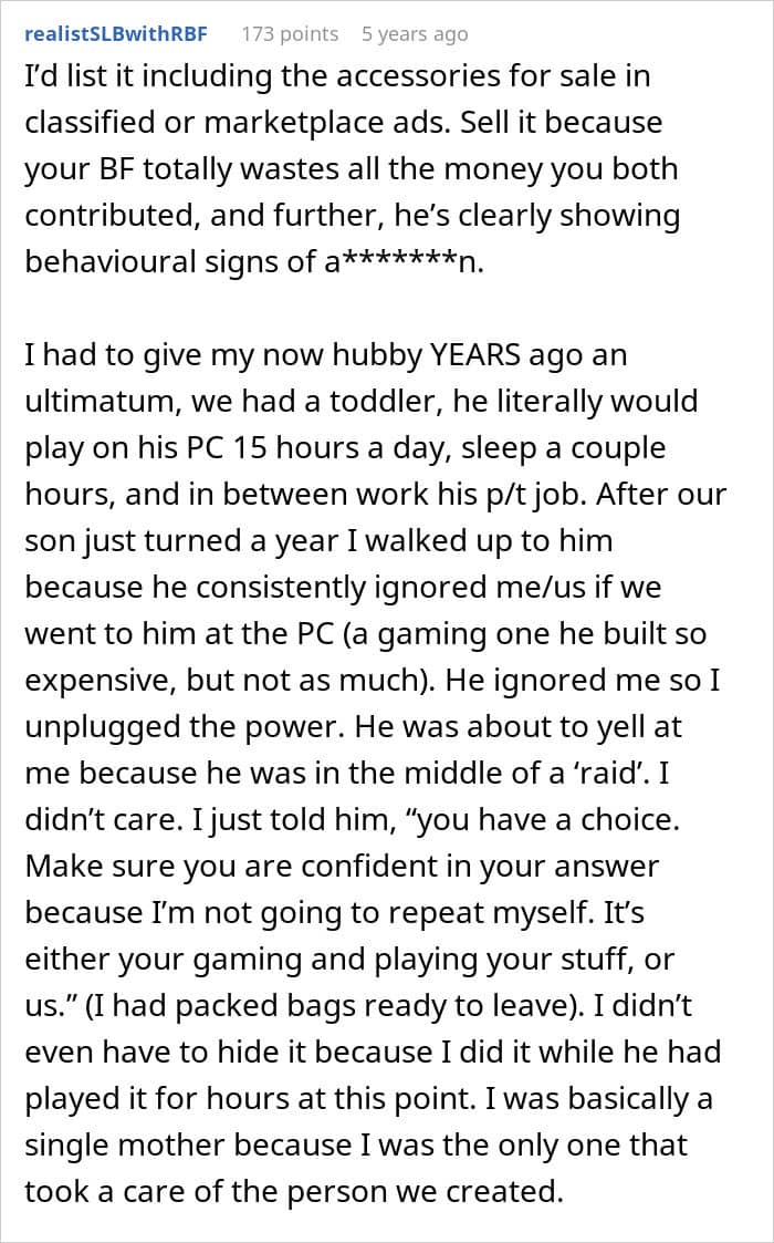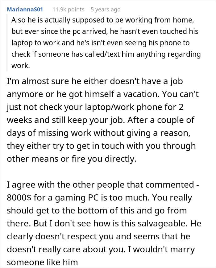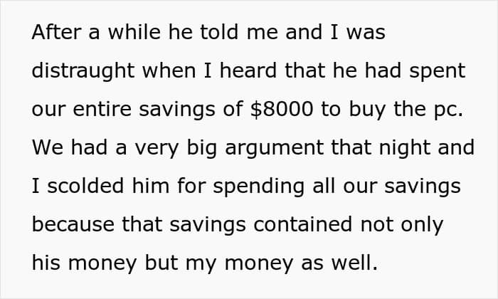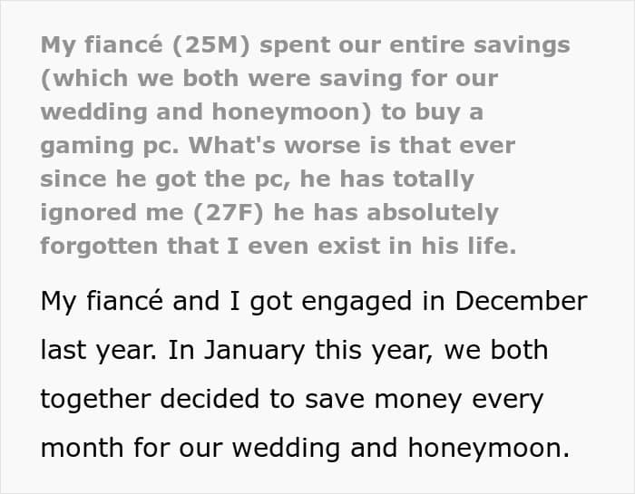 But everything changed when the fiancé decided he wanted a gaming PC. Without his partner fully realizing what he was doing, he blew their entire savings on his new setup. And ever since it arrived, he’s been glued to it, all but ignoring his fiancée and dropping every responsibility he used to share.