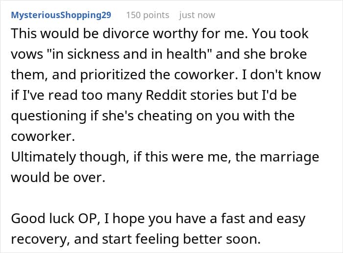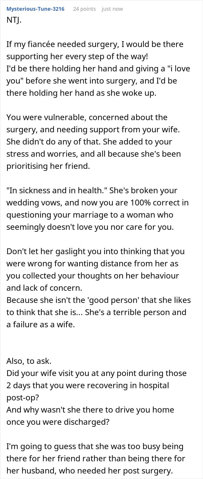 Netizens supported the OP’s decision to recover somewhere he felt cared for. They emphasized that a spouse’s role during major surgery is to provide emotional support, not prioritize someone else. What would you have done if you were in the OP’s shoes? Would you have gone home or stayed somewhere you felt supported? We would love to know your thoughts!