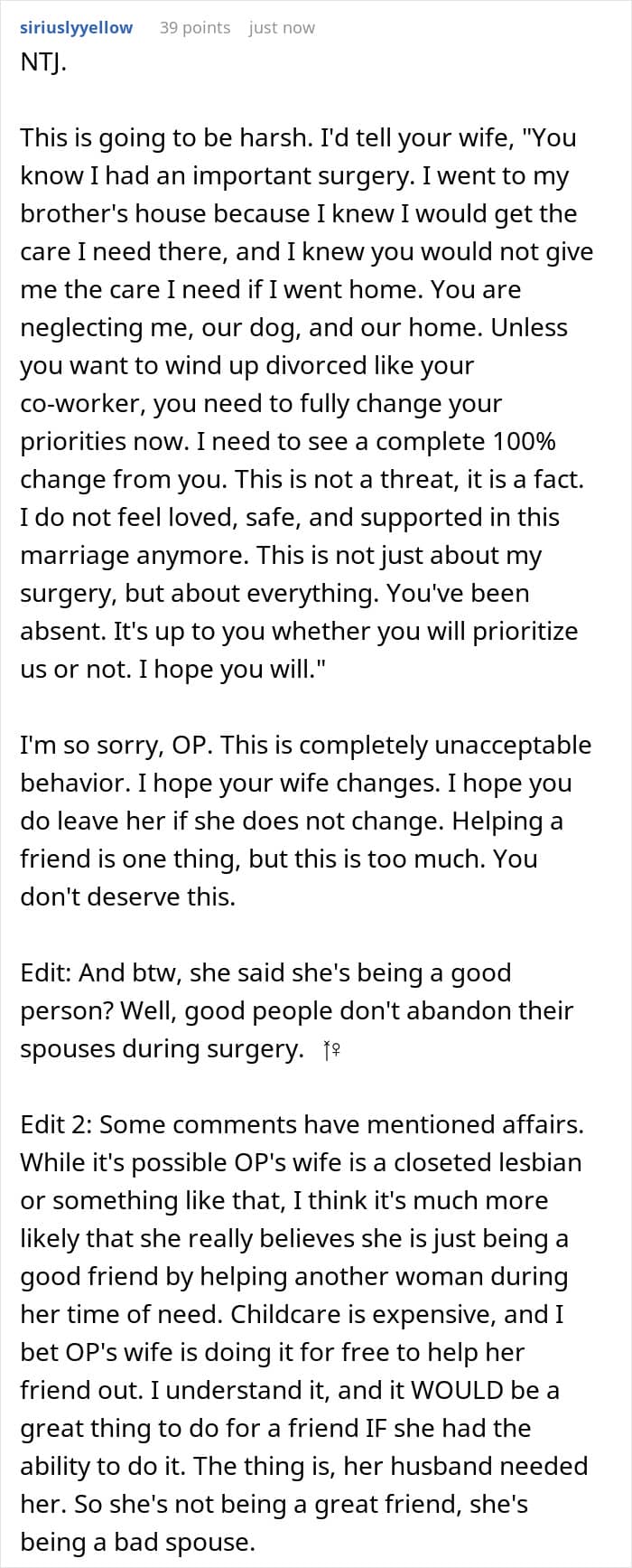 After today’s Original Poster (OP) had to go through pre-surgery and post-surgery without his wife there to hold his hands through everything, he decided he was tired of feeling alone. However, his decision still didn’t sit well with his wife.